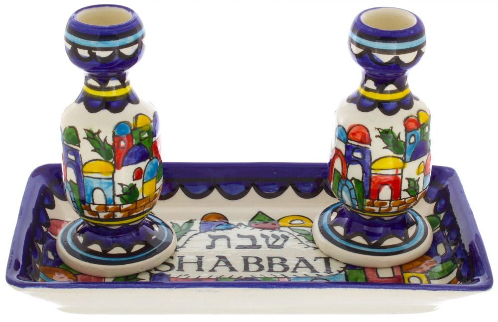Art Judaica Ceramic Armenian Candlesticks With Tray