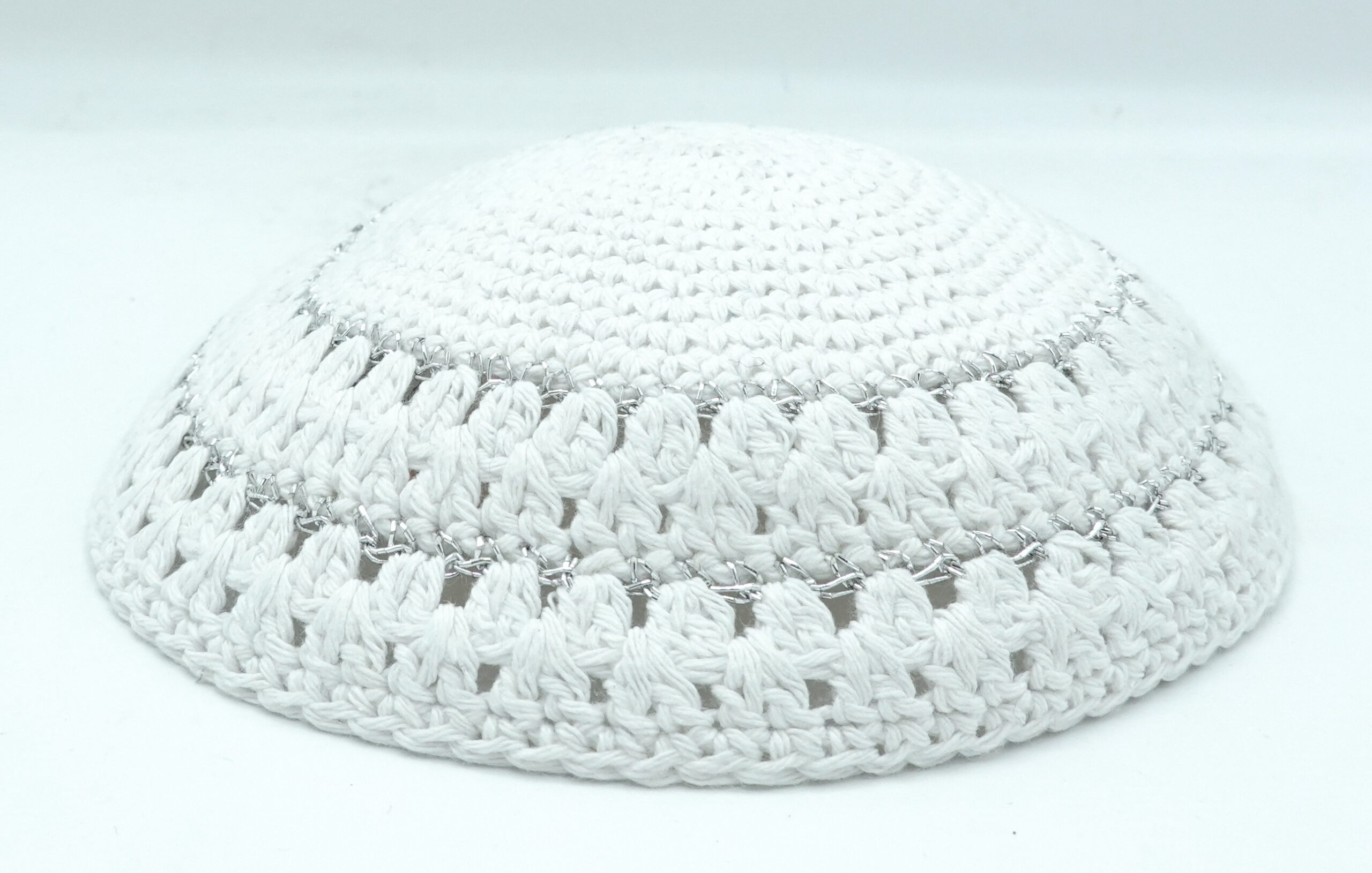 Art Judaica Knitted Kippah 17cm- White With 2 Silver Stripes