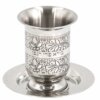 Elegant Stainless Steel Engraved Kiddush Cup, With Rounded Saucer.